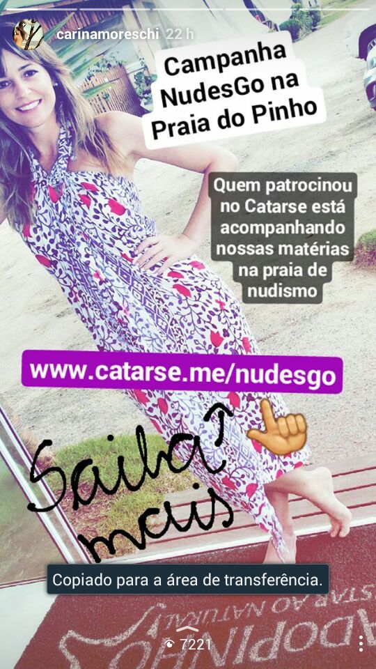 Carina, 35 anos, publicitária, ama os animais e a natureza. Naturista há 20 anos é referência nesta filosofia de vida. Com entusiasmo e naturalidade divulga a prática nas redes sociais, conquistando milhares de fãs.